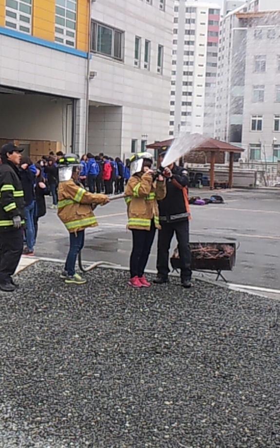 2013년 동기유발학기 미래직장방문시간에 남부소방서를 방문하여 화재진압 체험을 하고있다.