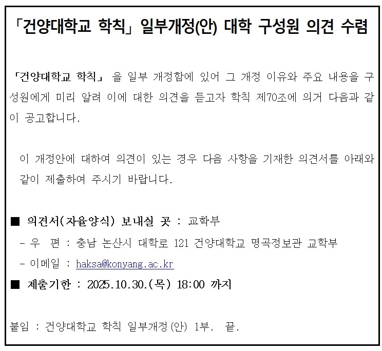 제목 | 「건양대학교 학칙」 개정(안) 대학 구성원 의견수렴 | ||||