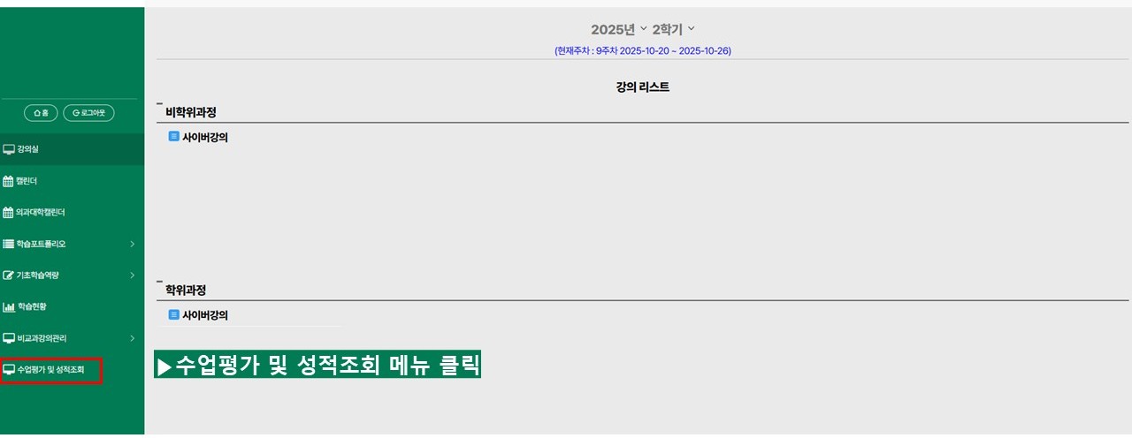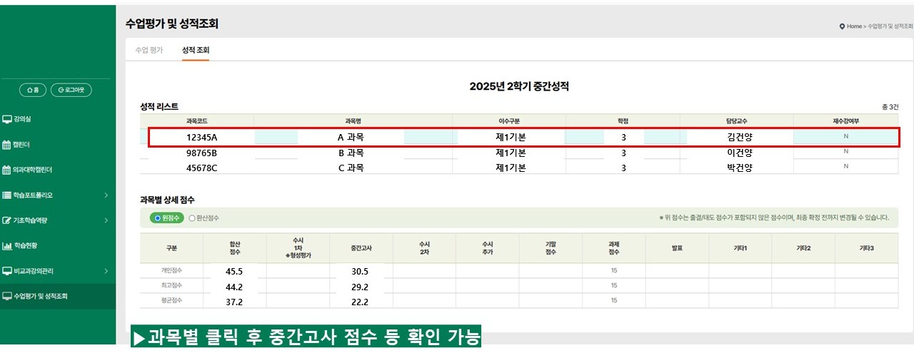 2025학년도 2학기 중간고사 성적 공람 일정 및 방법을 다음과 같이 안내하오니, 참고하여 주시기 바랍니다. ■ 중간고사 성적 공람 - 기간 : 2025.10.22.(수) 10:00 ~ 10.23.(목) 18:00 - 방법 : [LMS] - [수업평가 및 성적조회] 메뉴 활용 ※ 하단 성적확인 매뉴얼 참조