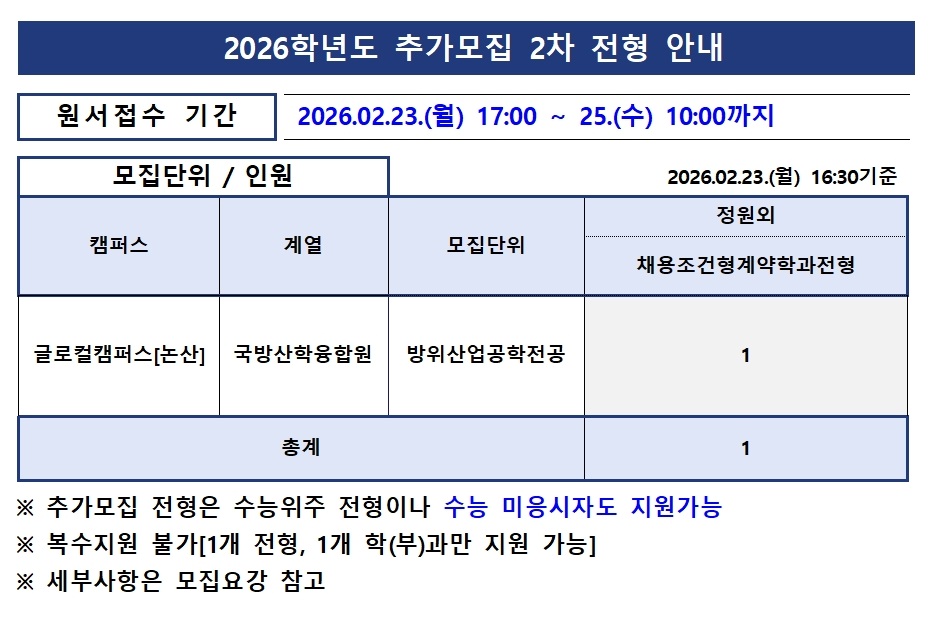 | 제목 | 2026학년도 추가모집(2차) 모집요강 탑재 안내(2026.02.23) | ||||