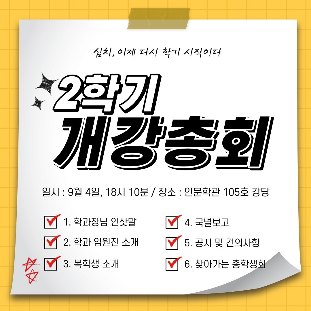 2023년 2학기 개강총회 일시 : 9월 4일(월) 오후 6시~7시 장소 : 인문학관 105호 강당 총회에서는 학과 주요 사항을 안내할 예정이오니 참석해 주시기 바랍니다. 학우분들의 많은 관심과 참여 부탁드리겠습니다. |