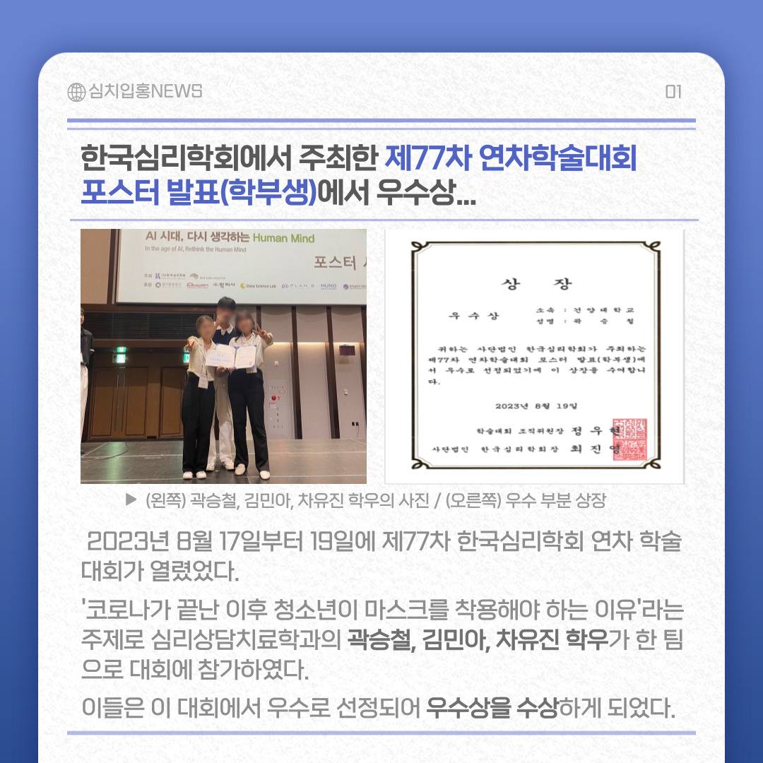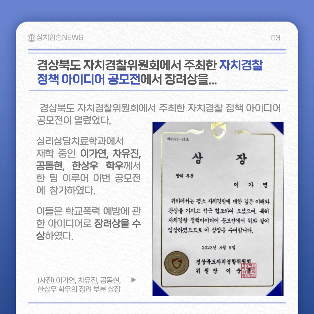 『 심리상담치료학과 학우 대회 및 공모전 수상 』글의 상세내용을 확인하는 표로 제목, 부서명, 등록일, 조회, 첨부, 내용으로 나뉘어 설명합니다.