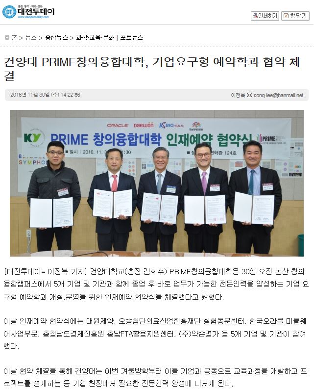 제목 | 건양대 PRIME창의융합대학, 기업요구형 예약학과 협약 체결 | ||||
