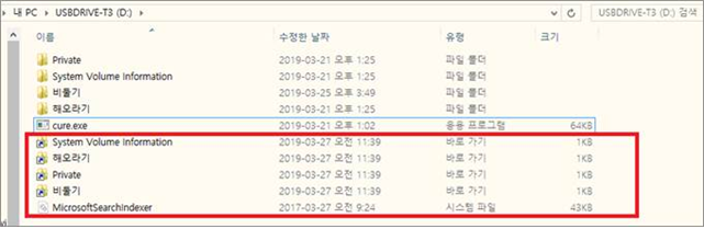최근 교내 일부 강의실에서 이동식 저장장치를 매개로 하는 악성코드가 확인 되었습니다. 해당 악성코드는 감염된 PC에 연결되는 이동식 저장장치만을 타깃으로 활성화 되며 감염 시 사용자저장매체 내의 파일을 숨기고 바로가기 형태의 아이콘을 생성하는 특징을 가지고 있습니다.