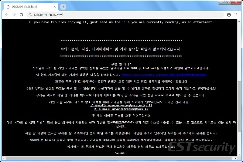 제목 | 국어 메시지를 사용하는 ‘메이즈 랜섬웨어’ 국내 유포 | ||||