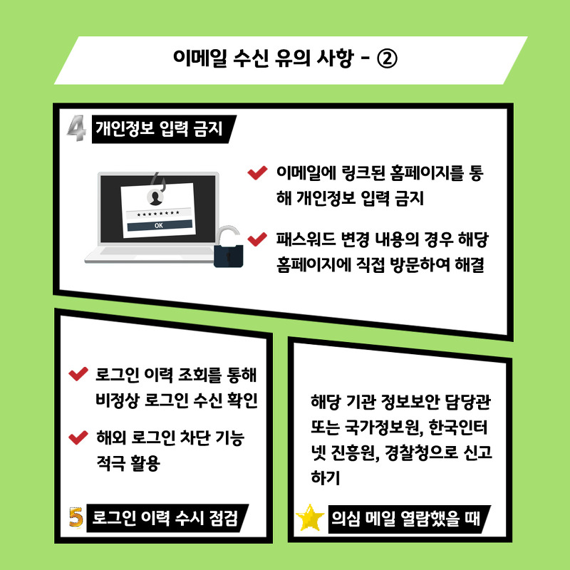 최근 이메일을 통한 해킹 시도가 눈에 띄게 증가하고 있으며 개인정보유출사고 등 해킹사고 최초 침입경로의 35%가 ‘이메일’을 통해서 발생하고 있습니다. 이러한 해킹 사고의 대부분은 기관 및 공공기관 사칭해 이루어지며 악성코드를 은닉한 첨부파일이나 가짜 웹사이트 링크 등이 포함된 이메일 공격으로 구성됩니다. 이에 정보통신원 에서는 이메일을 통한 침해사고 피해 발생 예방을 위한 방안으로 ‘이메일 수신 유의사항’을 안내 드립니다. 아래 다섯 가지 사항을 확인하시어 업무 및 개인 사서함을 통해 수신되는 악성메일 위협에 대한 대응 강화 부탁드립니다.