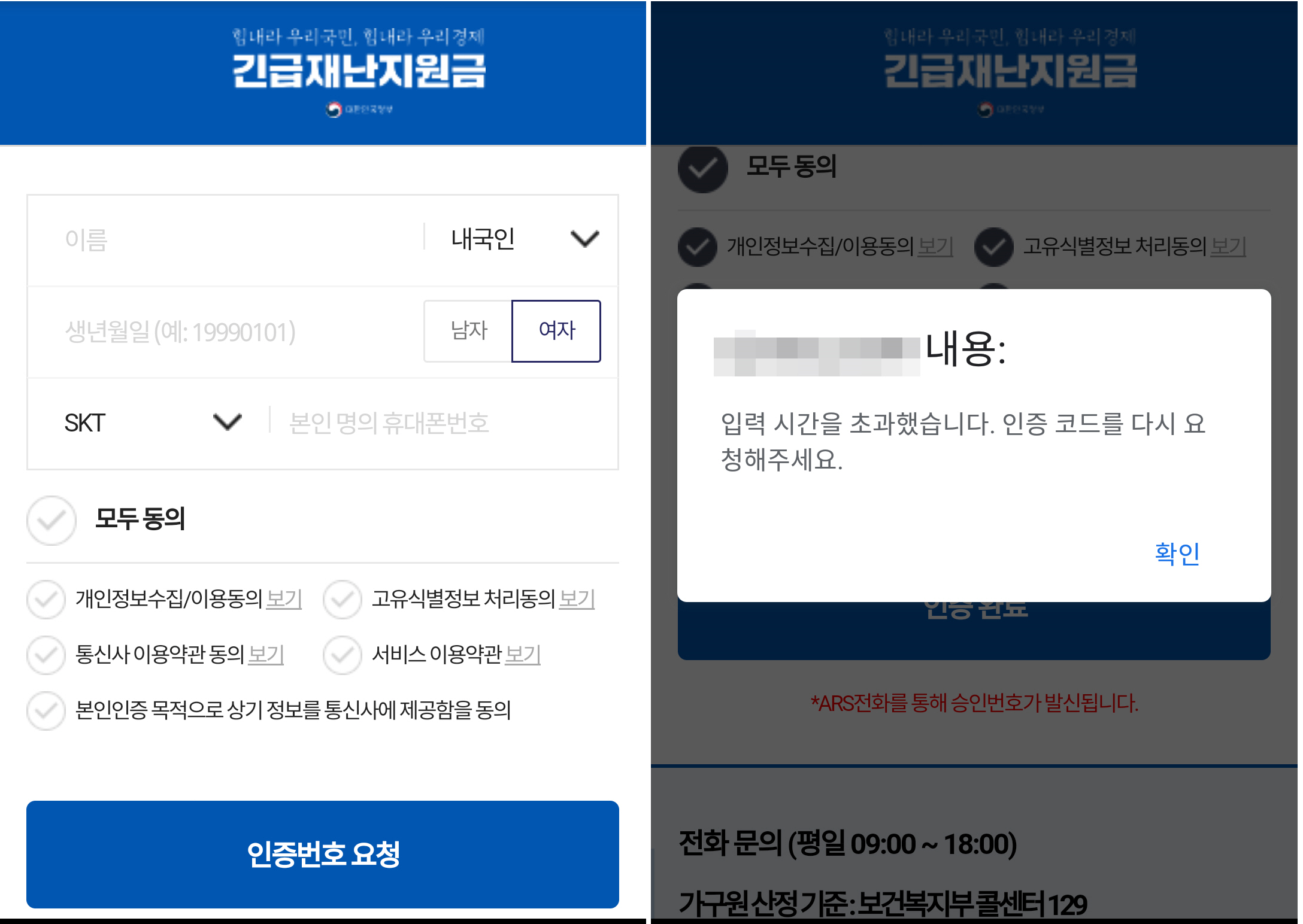 [그림1] 정부 긴급재난지원금 사이트로 위장된 피싱 사이트 발견된 스미싱은 11일 오후부터 다수 유포되고 있으며 문자 메시지의 내용은 스미싱 공격자가 주로 사용하던 ‘택배’ 사칭 메시지가 그대로 재활용 되었습니다 스미싱 문자에는 ‘주소가 불분명하여 배달이 불가능하다’ 는 택배 사칭 내용이 적혀있으며, 문자에 첨부된 인터넷 주소(URL)을 클릭하면 공격자가 제작한 가짜 ‘정부 긴급재난지원금 신청’ 사이트로 이동 되며 사용자가 가짜 사이트에 자신의 개인정보를 입력 후 인증번호 요청 버튼을 클릭하면 입력된 개인정보가 공격자에게 전달되며 ‘인증번호 요청’ 버튼 클릭 후 일정시간 경과 시 입력시간 초과 알림을 표기합니다.