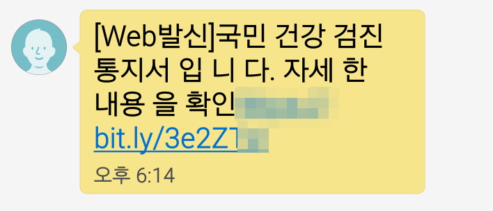 최근 ‘국민 건강 검진 통지서입니다. 자세한 내용을 확인’ 이라는 내용의 스미싱이 급속도로 유포되고 있어 사용자의 각별한 주의가 요구 됩니다.