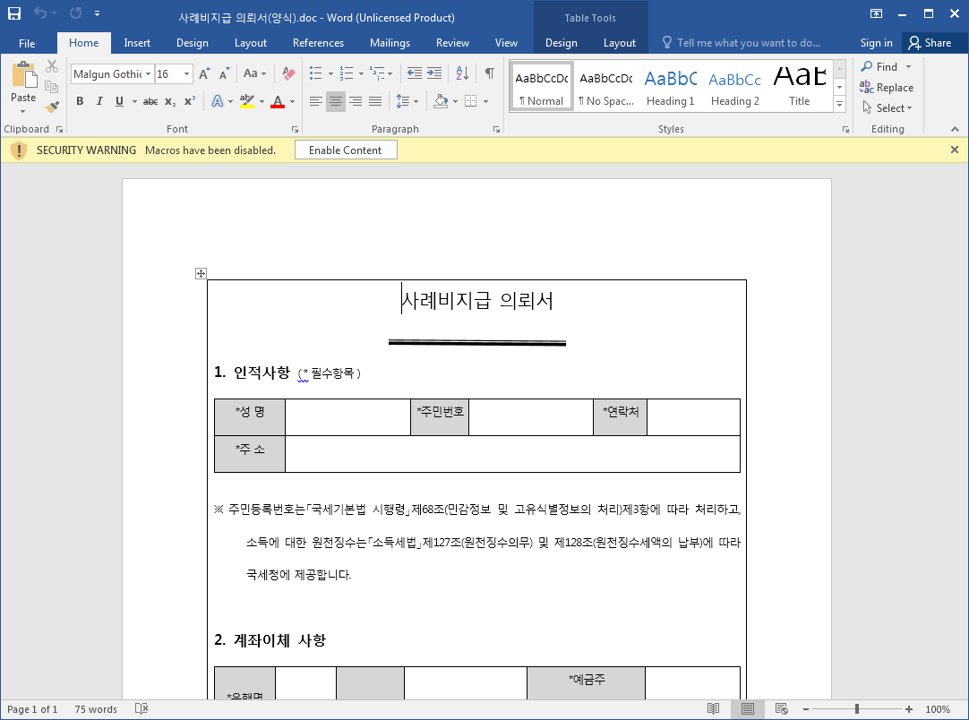 제목 | ‘사례비 지급 의뢰서’ 악성 워드 문서 유포 주의 | ||||