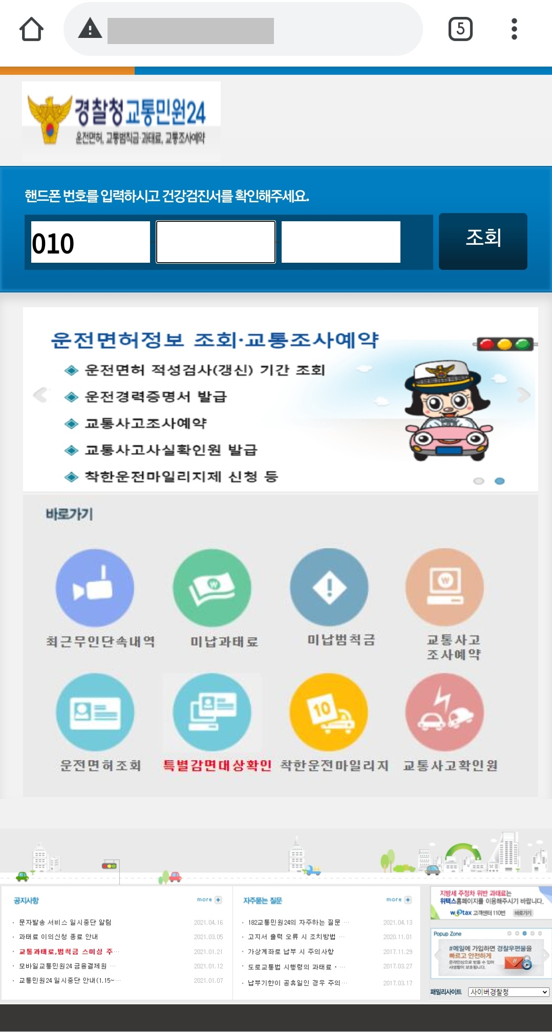 최근 ‘질병관리청’, ‘건강검진’ 키워드로 스미싱이 대량으로 유포되고 있는 가운데 경찰청을 위장한 스미싱이 유포되고 있어 사용자의 주의가 필요합니다. 보안 전문 업체 ‘이스트 시큐리티’ 에 따르면 이번에 유포되고 있는 스미싱은 "[Web발신] 차량 벌점 위반 처벌 발송 완료 http:// "라는 문구로 유포되고 있으며, 사용자가 문자에 포함되어 있는 링크를 클릭하면 다음과 같은 순서로 사용자 정보를 유출합니다. ※ 유출 순서 : 휴대폰 번호 → 이름 및 생년월일 → 악성 APK 전달 → 금융정보 유출 1. 문자 내 악성 URL을 클릭하면 다음과 같은 랜딩 페이지로 이동 → 랜딩 페이지는 경찰청 교통민원24로 위장하고 있으며 사용자의 휴대전화 번호를 입력을 유도