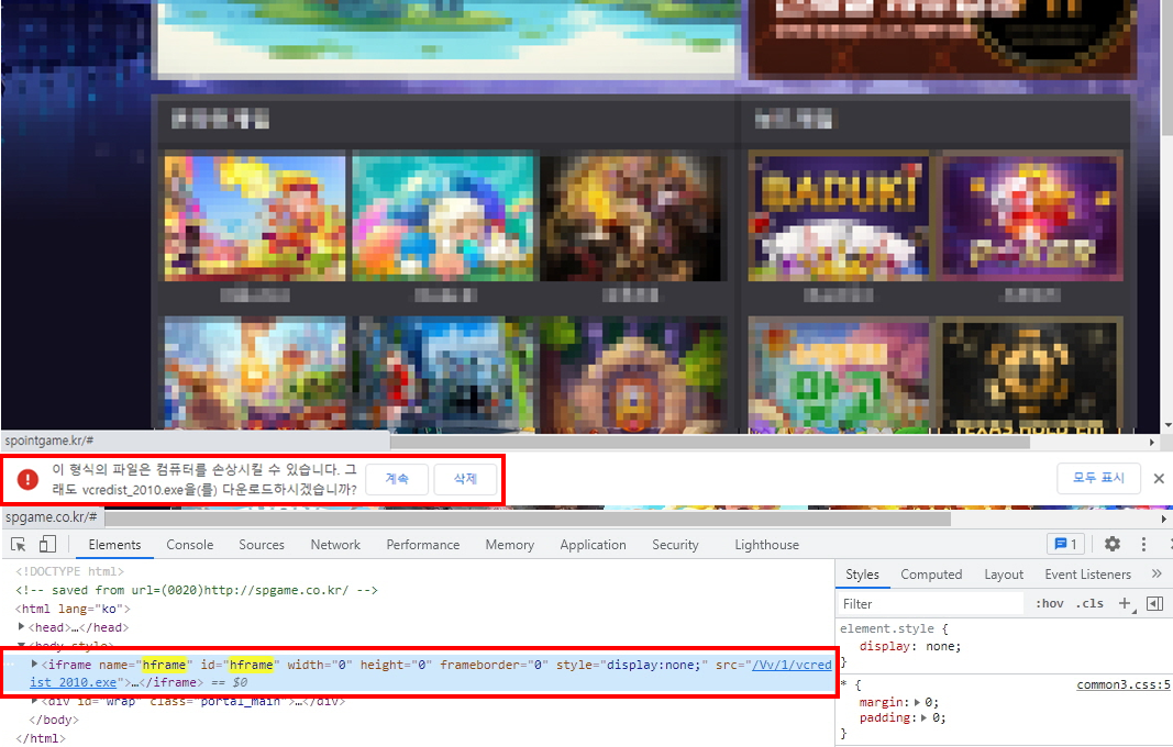 최근 접속 시 자동으로 악성 파일이 다운로드 되는 사행성 사이트가 발견되어 사용자들의 각별한 주의가 요구 됩니다. 보안 전문 업체 ‘이스트 시큐리티’ 에 따르면 해당 홈페이지 들은 사행성 도박게임을 할 수 있는 웹 페이지로 다수의 홈페이지에서 동일한 악성 파일이 자동으로 다운로드 되는 증상을 확인하였습니다. [그림1] 자동으로 악성 파일을 다운로드하는 사행성 사이트 해당 파일은 페이지 내 삽입되어 있으며 자동으로 다운로드 된 vcredist_2010.exe 파일을 실행하면 추가로 RuntimeBroker.exe 파일을 C:\Windows\SysWOW64폴더 하위에 저장하고 자동으로 실행합니다. 자동으로 실행 된 RuntimeBroker.exe 파일은 컴퓨터 명, IP, MAC주소, 현재 상태 등을 포함하여 사용자 정보를 서버에 주기적으로 전송합니다. 해당 파일은 현재 사용자가 진행하는 게임 파악 및 단순 사용자 상태 로그 수집 목적으로 보이나 공격자가 해당 파일을 이용하여 사용자 PC에 추가적으로 파일을 설치 할 수 있어 향후 악성행위를 할 가능성이 있어 사용자들의 주의가 필요합니다. 현재 알약에서는 해당 파일들에 대해 Trojan.Dropper.MSIL, Spyware.Infostealer.RedLine 로 탐지 및 치료가 가능합니다.