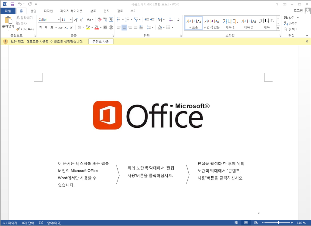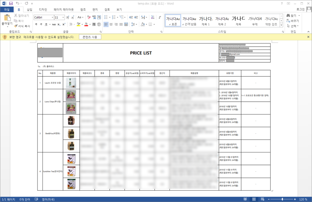 최근 제품소개서로 위장한 악성 워드문서가 이메일을 통해 유포되고 있어 사용자의 주의가 요구 됩니다. 보안 전문 업체 ‘안랩’에 따르면 정보 탈취 목적의 악성 워드 문서가 유포되고 있으며 문서 내부에 특정 제품들에 대한 설명을 포함하여 ‘제품소개서.doc’ 라는 제목을 사용하고 있는 것으로 확인되었습니다. [그림] 제품소개서 .doc 파일 내부 해당 문서 내부에는 악성 VBA 매크로가 포함되어 있으며 사용자가 매크로 실행 시 악성 매크로가 자동으로 실행되어 추가 악성 파일이 다운로드 되며 temp.doc 파일을 실행시킵니다.