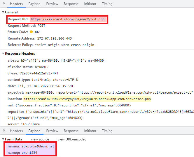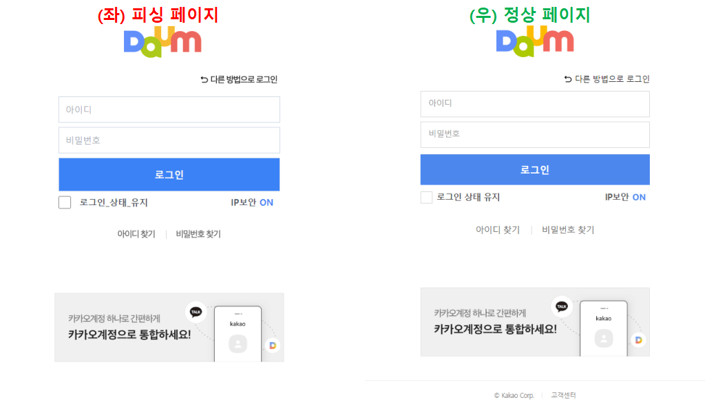 첨부 파일은 HTML 파일로 이루어져 있으며, 첨부 파일을 실행하면 아래 악성 주소로 리다이렉션 됩니다. ※ 공격자 악성 주소 : hxxps://euoi8708twufevry4yuwfywe8y487r.herokuapp[.]com/sreverse.php [그림] 첨부된 HTML 파일 소스 코드 해당 페이지 리다이렉션 이 후 아래와 같이 Daum 사이트로 위장한 로그인 페이지(좌)가 출력되며 실제 로그인 페이지(우)와 비교했을 때 비슷하게 꾸며져 있어 사용자의 식별이 제한됩니다. 피싱 페이지는 실제 로그인 페이지와 다르게 로그인 버튼 외 다른 버튼의 경우 정상적으로 동작하지 않습니다. [그림] 피싱 사이트(좌) 와 정상 사이트(우) 비교 사용자가 피싱 페이지를 정상 로그인 페이지로 인식하여 계정 정보를 입력 후 로그인을 시도하게 되면 공격자에게 입력한 계정 정보를 전달하게 되며, 그 후 로그인 페이지로 다이 시동되어 비밀번호가 잘못되었다는 문구를 보여주고 다시 사용자에게 계정 정보를 입력 받도록 합니다. 계정 정보 입력 후 로그인 버튼을 클릭하여 계정 정보를 전달하게 되면 계정 아이디의 도메인 주소(Daum 메인)로 리다이렉트 되어 이동하는 방식의 패턴을 가지고 있어 사용자는 입력된 정보가 유출되는 상황을 인지하기 어려워 추가 피해가 발생 할 수 있습니다. [그림] 로그인 버튼 클릭시 전송되는 데이터 이와 같은 피싱 메일은 다양한 패턴이 존재하고 있어 사용자들의 각별한 주의가 요구되며 발신자가 불분명한 메일과 출처를 알 수 없는 첨부파일을 실행하지 않도록 해야 하며, 특히 로그인 화면이 표시될 때 주소를 꼭 확인하여 자신이 로그인 하는 대상 사이트와 일치하는지 확인해야 합니다. |