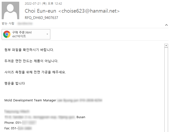 최근 국내 포털 사이트 Daum(다음) 으로 위장한 피싱 메일이 유포되고 있어 사용자의 주의가 요구 됩니다. 보안 전문업체 ‘안랩’에 따르면 2022년 7월 21일에 국내 포털 사이트 중 하나인 Daum 으로 위장한 피싱 메일이 유포되고 있는 정황을 확인하였습니다. 해당 피싱 메일은 제목에 ‘RFQ’ 를 포함하여 견적 요청서로 위장하고 있으며 첨부파일을 이용하여 피싱 페이지로 사용자를 유도하도록 되어 있습니다. [그림] 피싱메일 본문