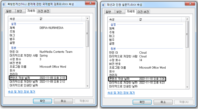 [표] 정상 · 악성 URL 비교 수집된 일부 워드 문서의 속성을 통해 해당 악성문서가 짧은 간격으로 수 일에 걸쳐 무분별하게 생산 및 배포되고 있는 것을 확인 할 수 있으며 사용자가 해당 URL을 활성화 하게 되면 개인정보 유출 및 2차 피해가 발생할 수 있어 각별한 주의가 요구됩니다. [그림] 악성 워드 문서 속성 이러한 악성 워드문서에 속아 사용자의 중요 정보가 공격자에게 유출되어 2차 피해가 발생할 수 있기 때문에 발신자가 불분명하거나 의심스러운 이메일 및 채팅방에 포함된 첨부파일 열람을 지양하고 첨부된 문서파일 열람 시 [콘텐츠 사용] 기능을 활성화 하지 않아야 합니다. |