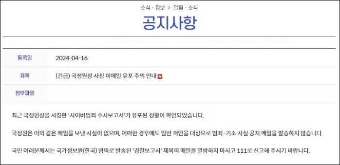 제목 | 국가정보원 사칭 이메일 유포 주의 | ||||