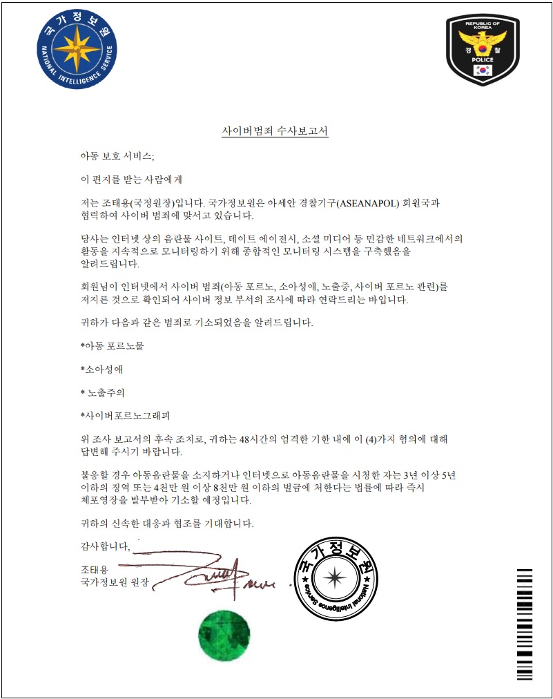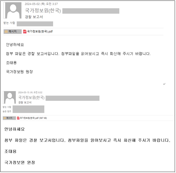※ 본 내용은 보안 전문업체 ‘이스트시큐리티’의 블로그 기고문을 참조하여 작성하였습니다. 최근 국가정보원을 사칭한 피싱 메일 유포가 식별되고 있어 사용자의 주의가 요구 됩니다. 지난 4월 이후 국가정보원을 사칭한 피싱 메일 유포가 식별되어 관련 내용이 국정원 공지사항을 통해 안내 되고 있으나 해당 피싱 메일이 지속적으로 유포되고 있는 것으로 확인되었습니다. [그림] 국정원 공지 내용 보안 전문업체 ‘이스트 시큐리티’에 따르면 해당 메일은 ‘경찰보고서’ 라는 제목으로 발신자명을 국가정보원으로 위장하고 발송되었으며 ‘국가정보원(한국).pdf’ 파일이 첨부되어 있습니다. 해당 피싱 메일에는 첨부된 경찰 보고서를 읽어보고 즉시 회신해달라는 내용으로 첨부파일 확인을 유도하며, 첨부된 PDF 파일에는 ‘사이버범죄 수사보고서’ 라는 제목으로 사이버 범죄에 기소되어 답변이 필요하며 불응시 체포될 예정이라는 내용을 담아 메일 수신자에게 위협을 주고 있습니다.