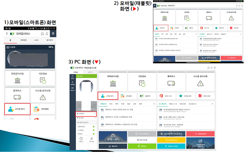2. 단말기별 [교직원 찾기] 화면 위치