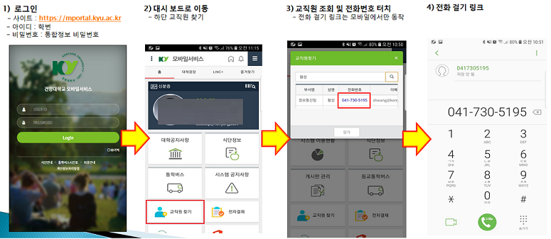 ○ 참고사항 - URL : https://mportal.kyu.ac.kr - 아이디/비밀번호 : 사번(교번)/통합정보 비밀번호 - PC : IE, 크롬에서 최적화 - 모바일 : 스마트폰, 태블릿 웹 브라우저, 앱을 통해 접속 가능 ※ 앱 설치 : 안드로이드/iOS 디바이스 별 앱 마켓 실행 후 건양대학교 모바일로 검색하여 설치 앱으로 접속 시 최초 로그인 후, 두 번째 실행부터는 자동 로그인 됨.