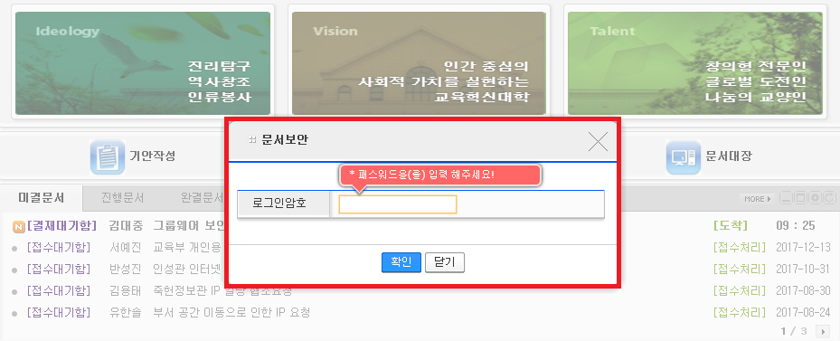 < 미결문서내 보안문서 클릭시 나타나는 암호 입력 팝업창 >