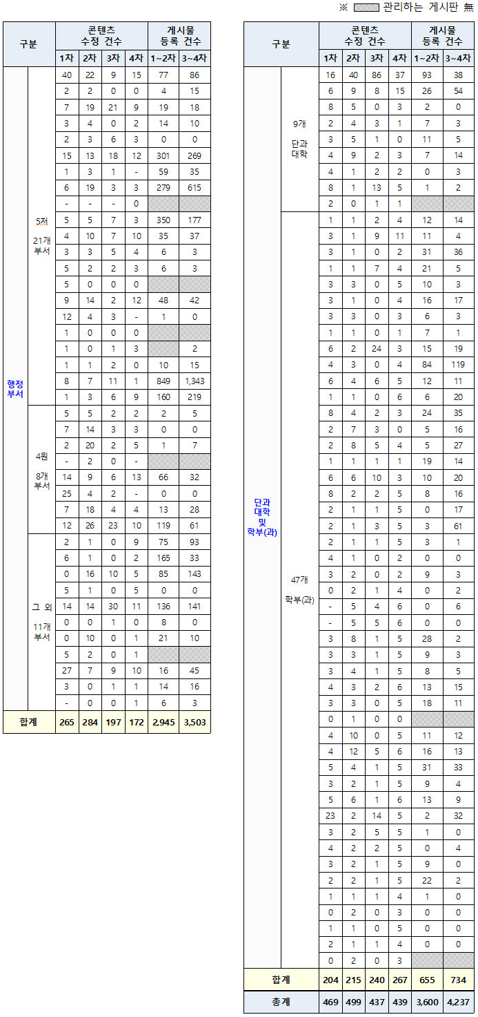 구분 | 점검 대상 전체 수 | 수정 진행/요청 대상 수 | 콘텐츠 업데이트 건수 | 게시물 등록 건수 |