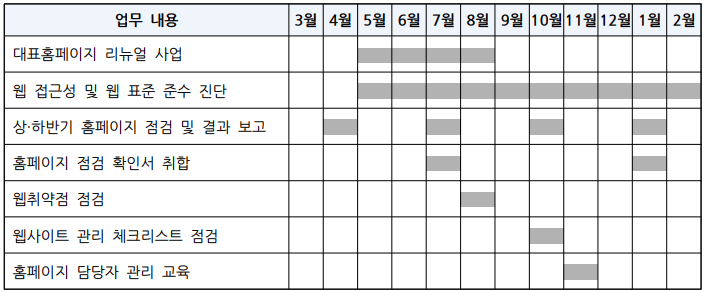 ◦홈페이지 운영 및 관리 - 홈페이지 점검 활동에 따른 홈페이지 정보 최신화 및 담당자 교육 실시 - 웹사이트 관리 체크리스트 점검 및 웹취약점 점검