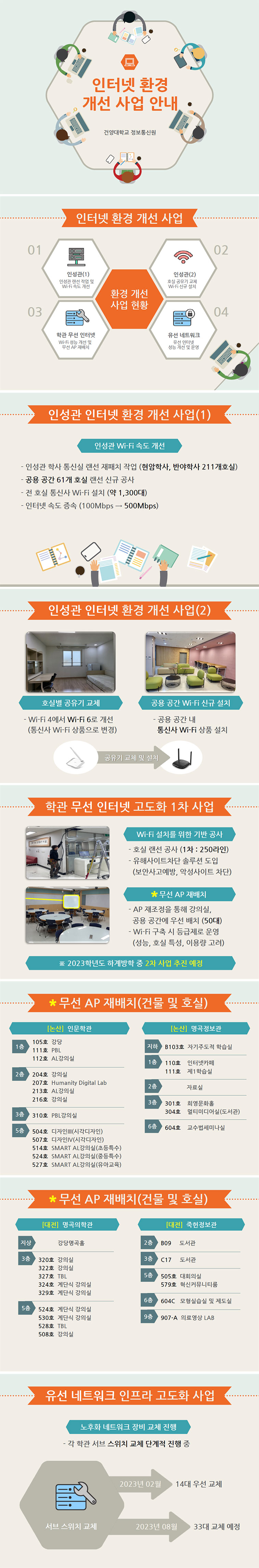 본교 인터넷 기반 서비스의 안정적이고 효율적인 제공을 위해 진행 중인 무선 인터넷 및 유선 네트워크 고도화 사업과 더불어 인성관 Wi-Fi 환경 개선 작업 현황을 다음과 같이 안내 드립니다.