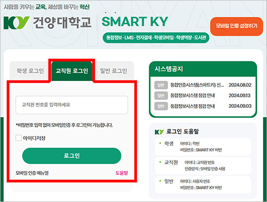 - 로그인 시 : "교직원 로그인" → "모바일 인증"을 통해 로그인(필수) ※ 추가 안내 : 그룹웨어(전자결재)의 경우 10.30(수) 부터 직접 로그인 불가