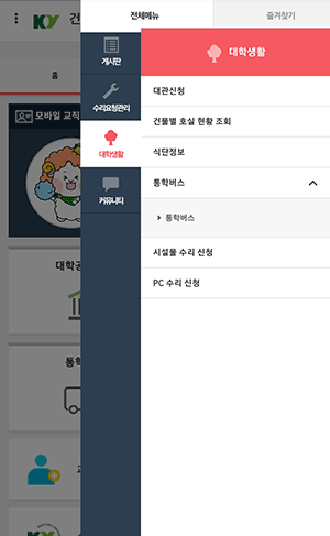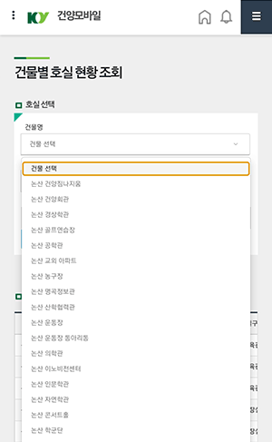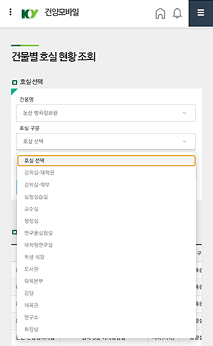 □ 경로 : 스마트키 로그인 > [건양모바일] 클릭 > 건양모바일 메뉴 > 대학생활 > 건물별 호실 현황 조회