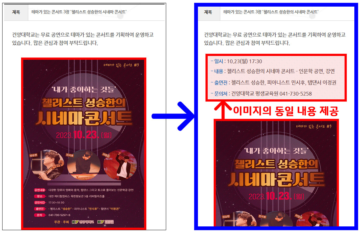 다음의 예시처럼 이미지를 설명할 수 있는 동일한 내용의 대체 텍스트를 함께 작성하여 정보를 제공해 주시기 바랍니다.