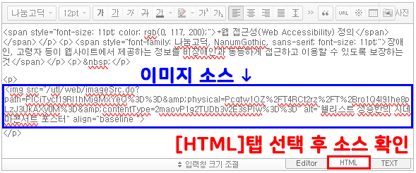 < 에디터창 [HTML]탭에서 이미지 alt 속성 적용 화면 >