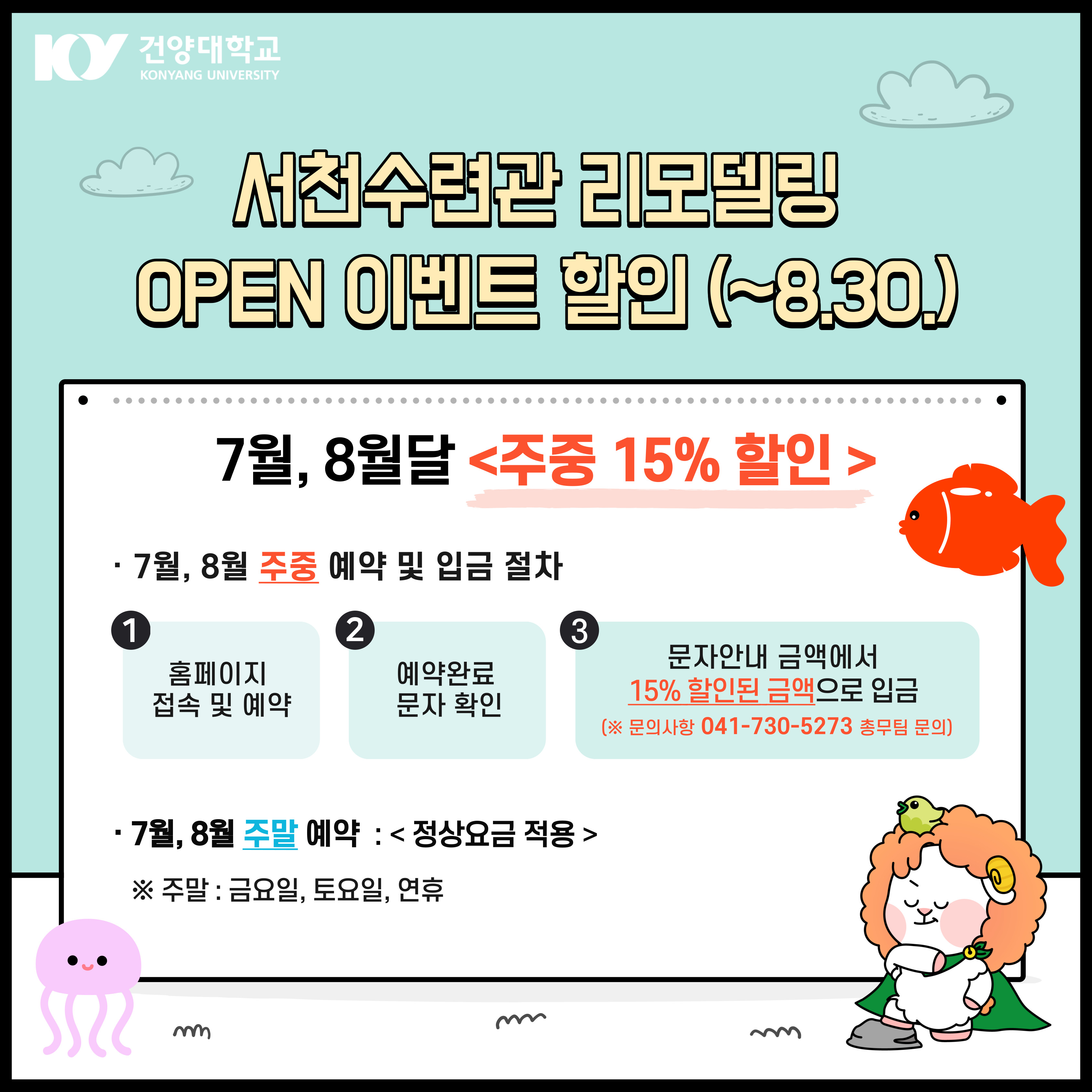 ★ 홈페이지 접속 및 예약 → 예약완료 문자 확인 → 문자 안내 금액에서 15% 할인된 금액으로 입금 (※ 문의사항 : 041-730-5273 <건양대학교 총무팀>)