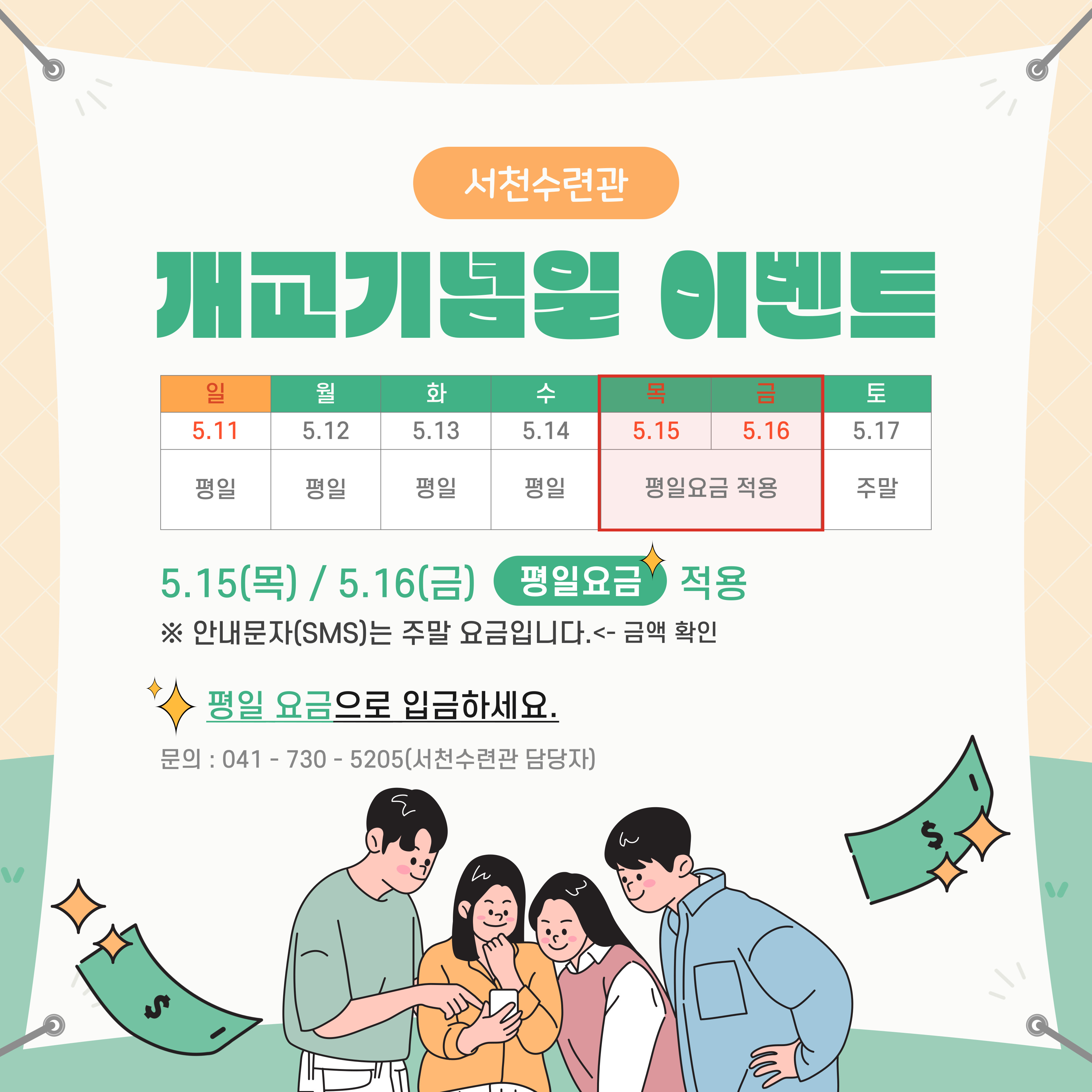 25학년도 개교기념일 할인 안내 입실일 기준 : 5.15(목) / 5.16(금) 할인내용 : 평일요금으로 적용(이용요금 참고)
