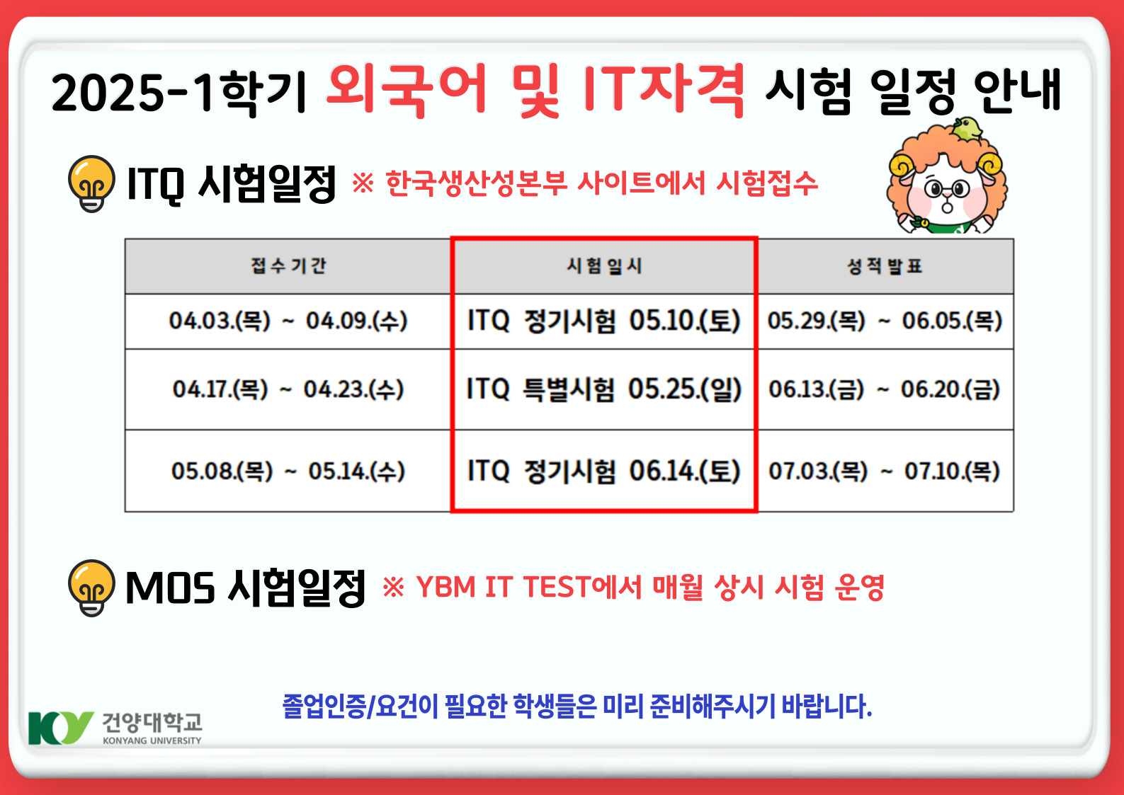 안녕하세요. 임상의약학과 행정실입니다. 2025-1학기 외국어 및 IT자격 시험 일정 안내드리오니 졸업인증 및 졸업요건이 있는 학생들은 미리 챙겨주시기 바랍니다.
