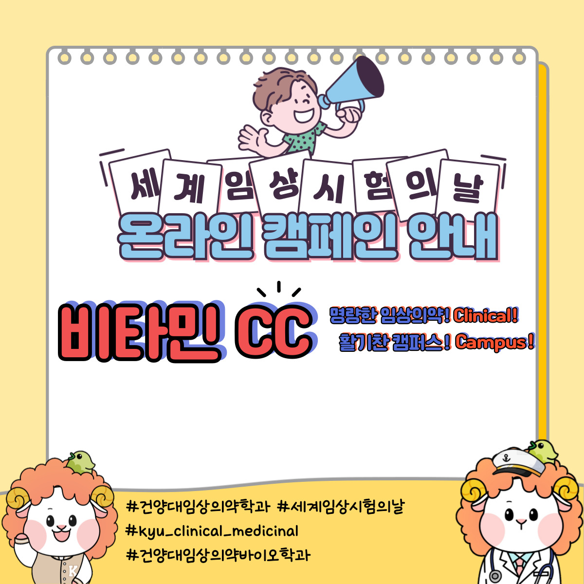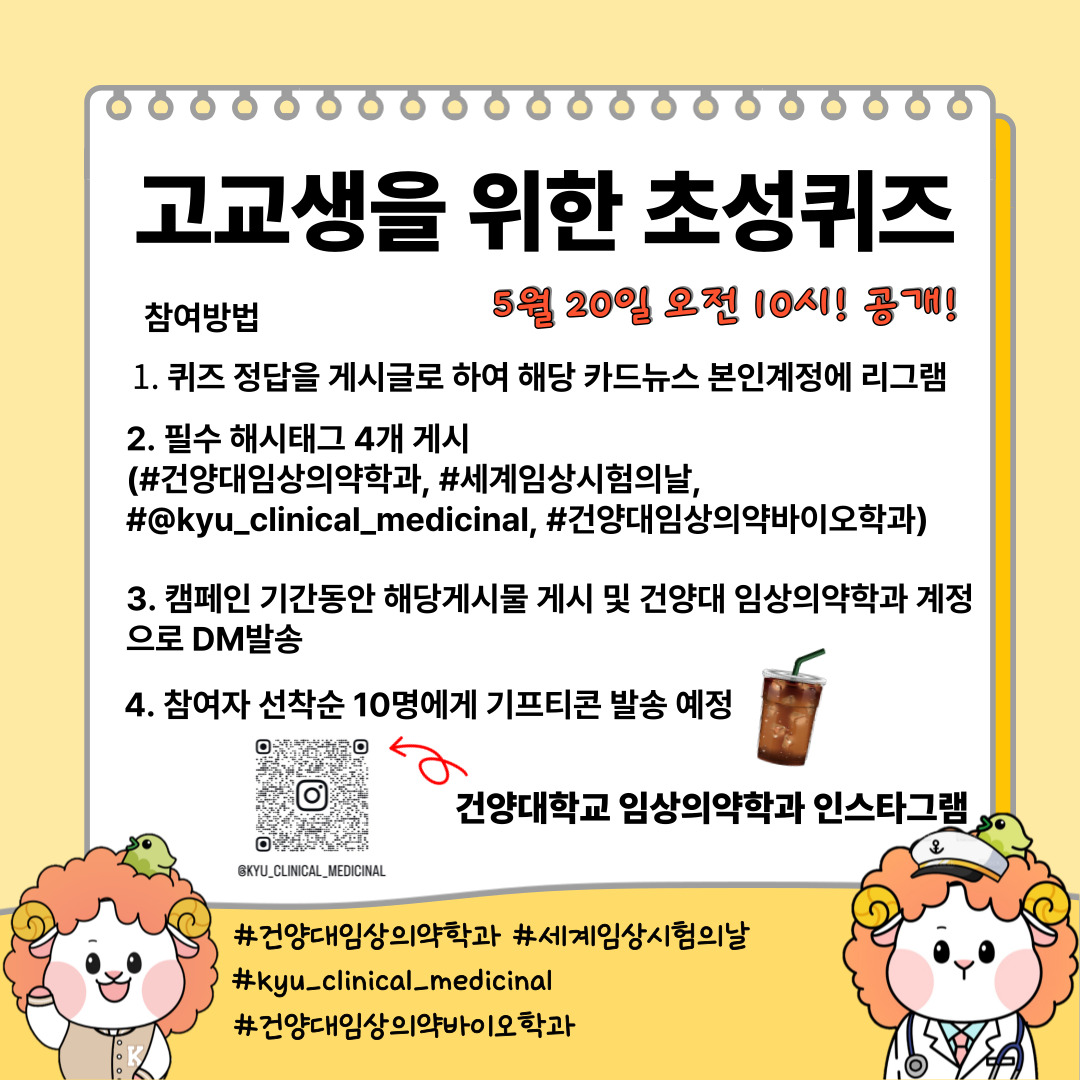 [고교생 대상] 세계 임상시험의 날 캠페인 안내드립니다. 건양대학교 임상의약학과 인스타그램에 5월20일 오전 10시에 초성 퀴즈가 공개됩니다! 위 참여 내용을 지키신 선착순 10분께 선물을 지급하오니 많은 참여 부탁드립니다! |