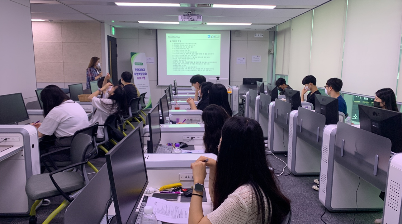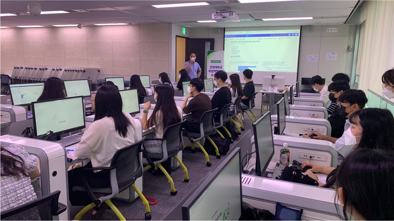 1. 프로그램 : 임상의약학과 취업역량 강화 프로그램 2. 운영주제 : CRO 데이터 관리 및 모니터링 3. 일 시 : ‘22.6.28(화) ~ 29(수) 3. 장 소 : 국가임상시험지원재단(KoNECT) 4. 인 원 : 임상의약학과 재학생 20명 5. 추진내용 - 3, 4학년 재학생의 국가임상시험지원재단 방문을 통한 대면 교육 - 현장 전문가 특강 및 실습 - 국내 CRO 분야에서 활용되고 있는 EMR, SDV 프로그램 및 환자 빅데이터를 이용한 산업체 직무교육 및 체험(국가임상시험지원재단의 협조)