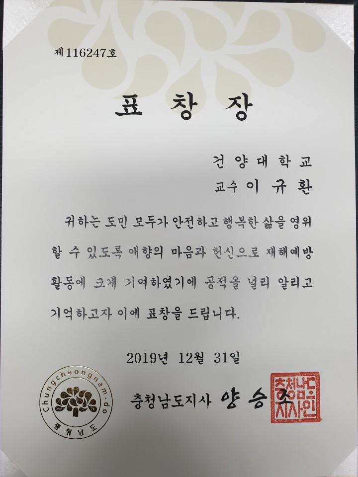 이규환 교수님 재난안전기여 분야 도지사상 수상 글의 상세내용