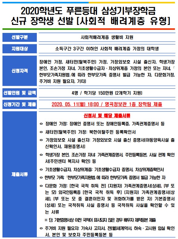 제목 2020학년도 푸른등대 삼성기부 장학생 선발 공고