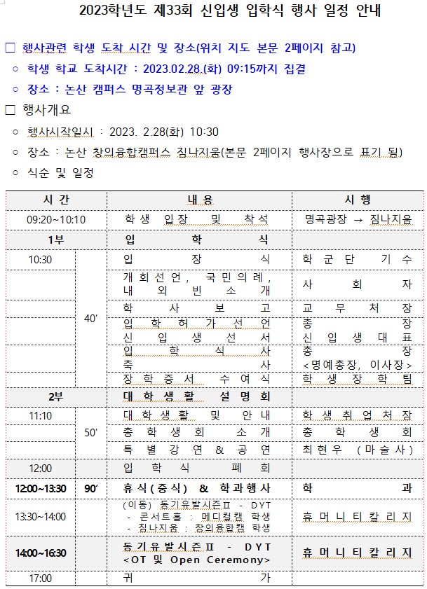 제목 | (1차 정정)2023학년도 제 33회 신입생 입학식 행사일정 안내 | ||||