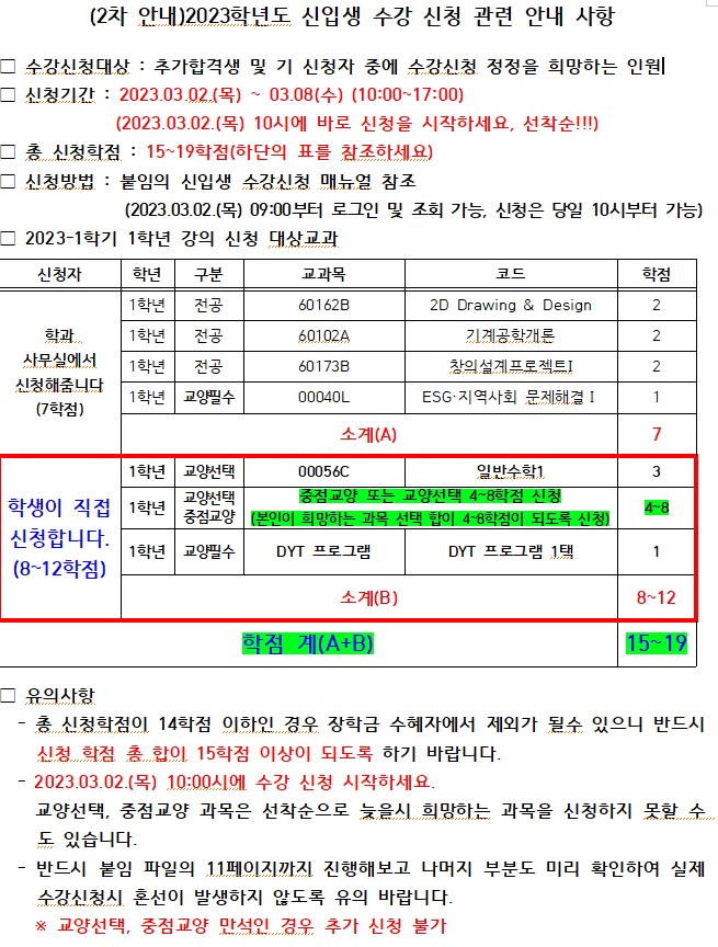제목 | (2차 안내)2023학년도 신입생 수강 신청 관련 안내 사항_추가합격자 및 정정인원 | ||||