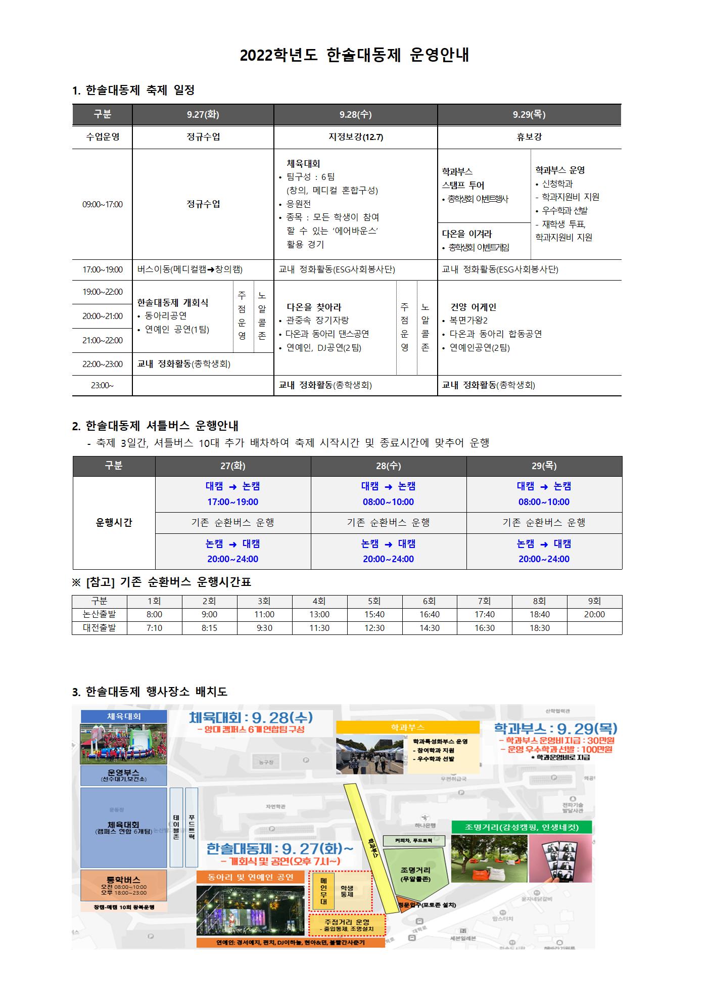 『 2022학년도 한솔대동제 운영 안내 』글의 상세내용을 확인하는 표로 제목, 부서명, 등록일, 조회, 첨부, 내용으로 나뉘어 설명합니다.