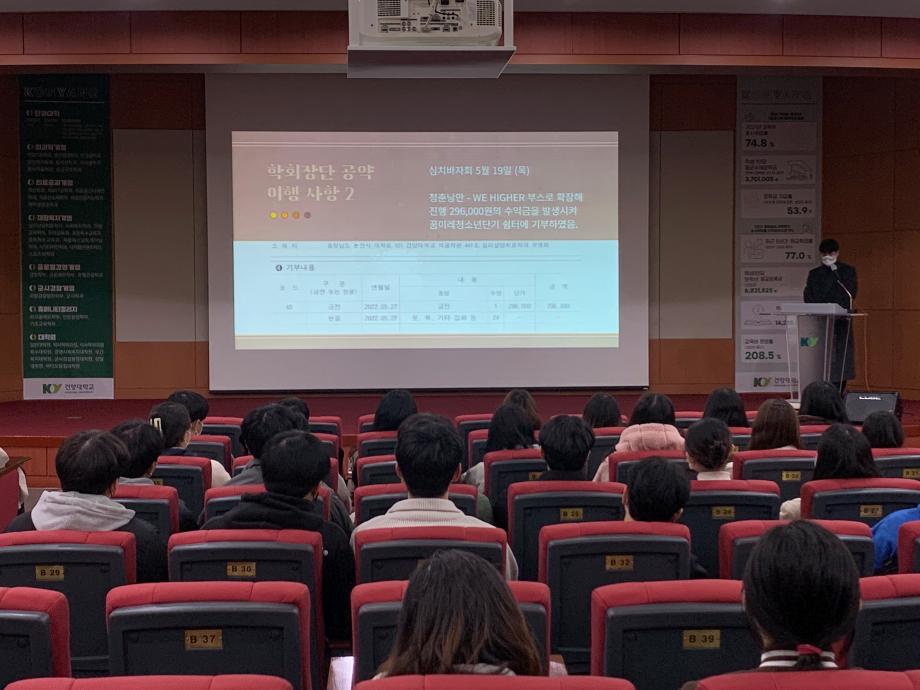 2022. 11. 28. (월) 한 학기를 마무리하는 심리상담치료학과 종강총회가 진행되었습니다. 이번 종강총회에선 학과 행사활동 보고, 국별보고, 학회장단의 공약 이행사항 보고, 대의원 활동 및 감사보고가 있었습니다. 공지톡방 통합과 과대 업무 조정, 학과 행사 상품 추첨과 관련한 학우 건의사항을 총회에 참석한 학우분들과 함께 논의하여 2023학년도 학과 운영방향에 대해 함께 논의하였습니다.