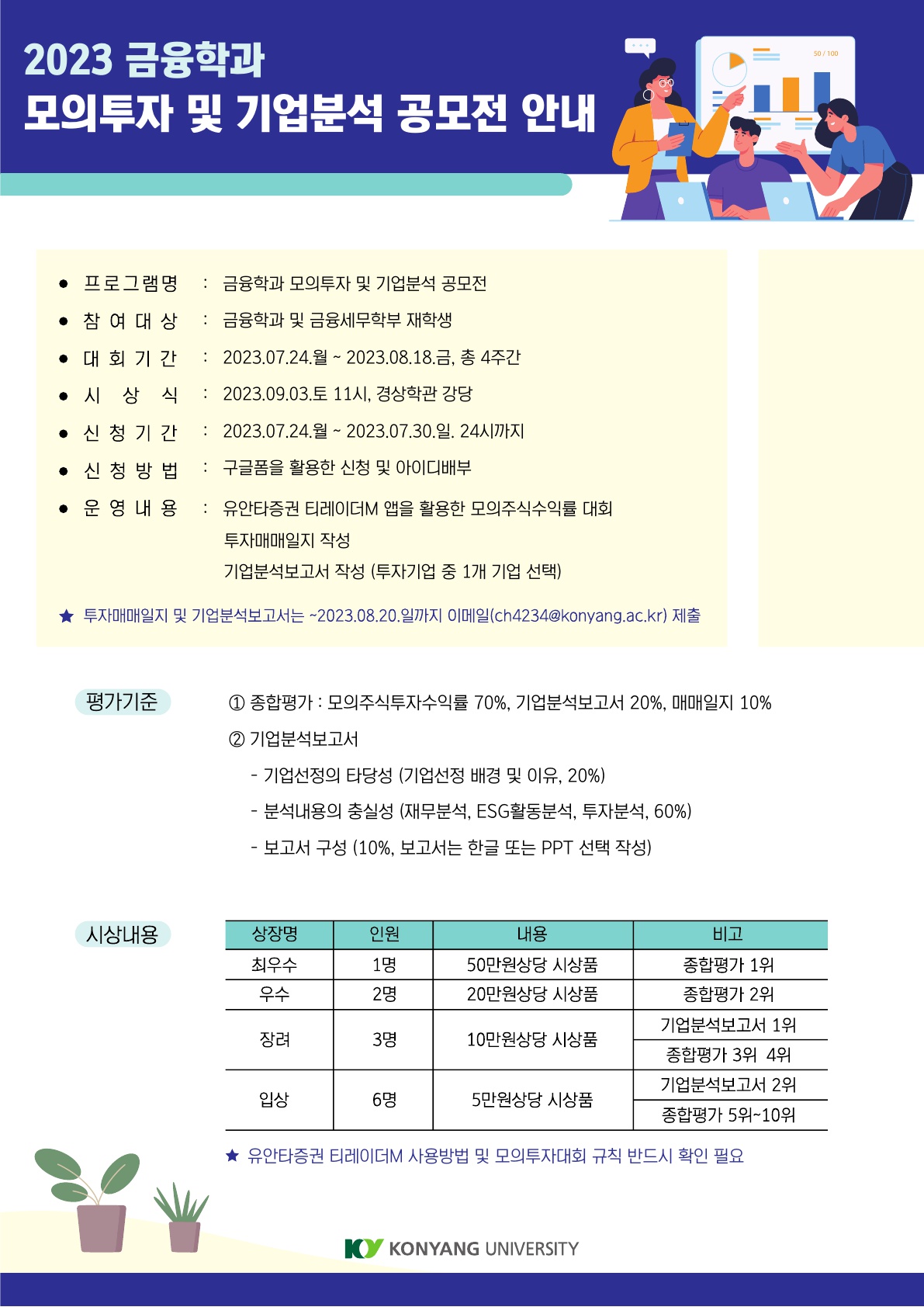 『 2023학년도 금융학과 모의투자대회 및 기업분석 공모전 안내 』글의 상세내용을 확인하는 표로 제목, 부서명, 등록일, 조회, 첨부, 내용으로 나뉘어 설명합니다.