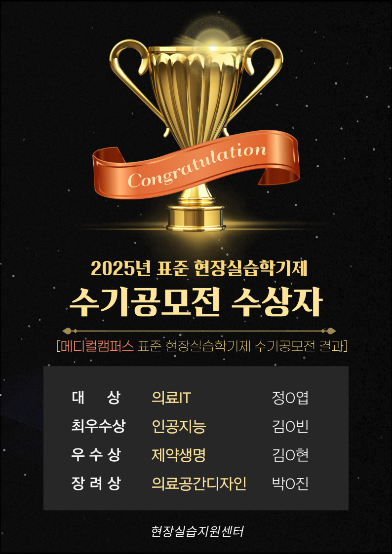 | 제목 | ★ 2025학년도 표준 현장실습학기제 수기공모전 결과 발표 안내(메디컬) | ||||