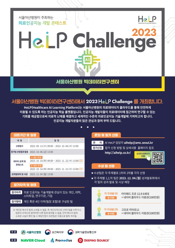 | 제목 | [서울아산병원] 의료인공지능 개발 콘테스트 HeLP Challenge 2023 | ||||