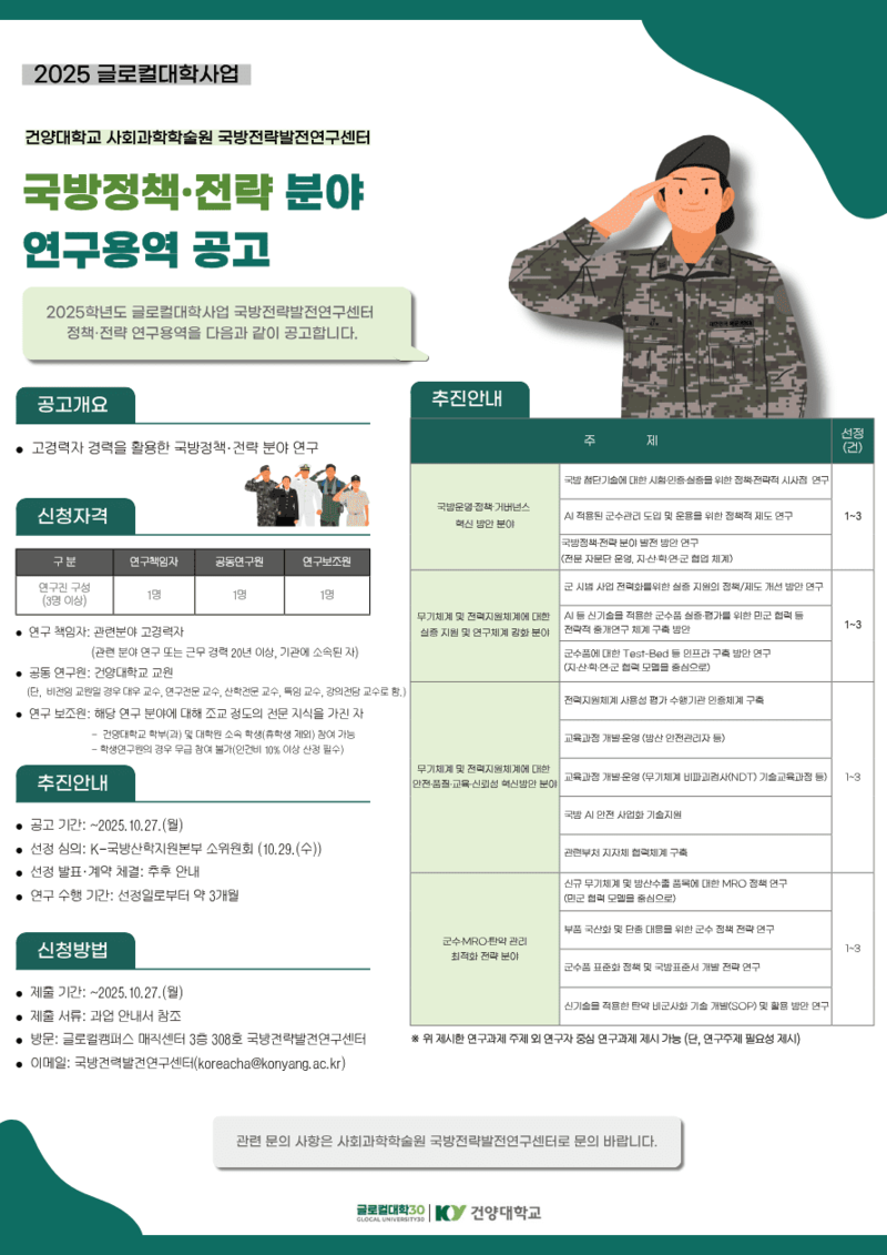 Title | [글로컬대학사업] 2025 국방전략발전연구센터 국방정책·전략 분야 연구용역 공고(~ 10.27.까지) | ||||