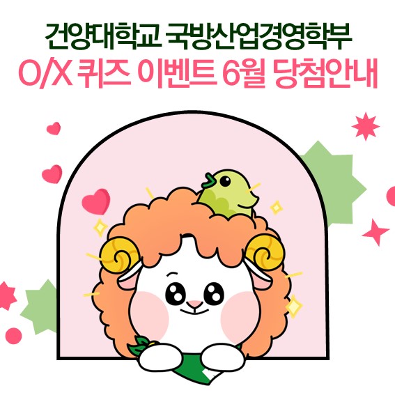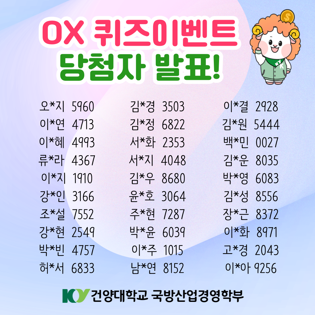 ⠀국방산업경영학부 이벤트에 참여해주신 모든 분들께 감사드리며,당첨되신 분들 진심으로 축하드립니다!?⠀앞으로도 더 유익한 정보와 풍성한 이벤트로 찾아뵐게요✨해당 이벤트는 8월까지 계속됩니다!!※ 당첨자 여러분께는 추가 개인정보 수집 없이 참여 시 입력해 주신 연락처로 경품이 발송됩니다.※ 사정에 따라 발송 일시, 경품 및 발송업체 변동이 있을 수 있습니다.⠀#건양대학교 #경영 #국방 #국방산업경영학부 #댓글이벤트 #이벤트 #이벤트참여 #퀴즈 #당첨 #응모 #경품 #EVENT #입시