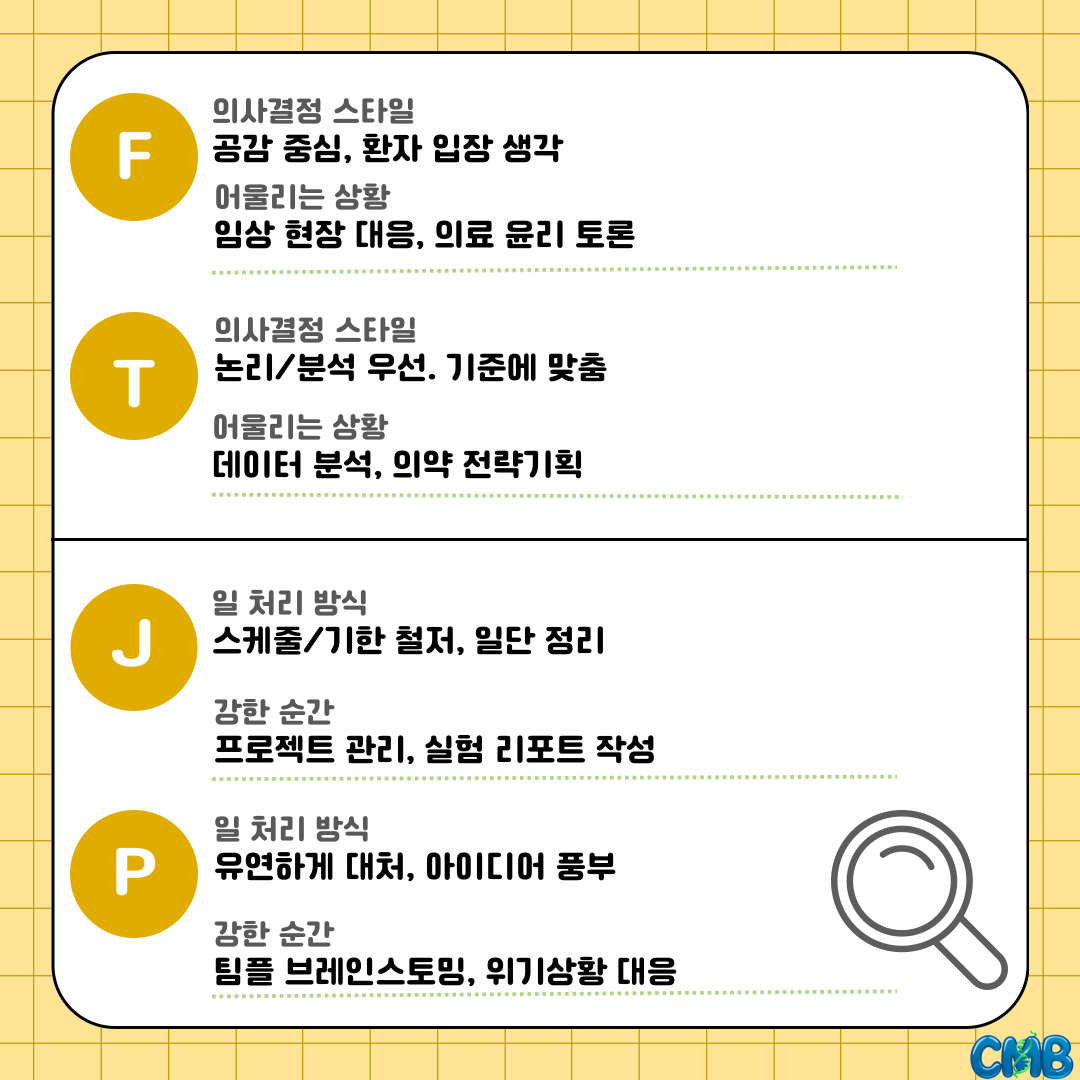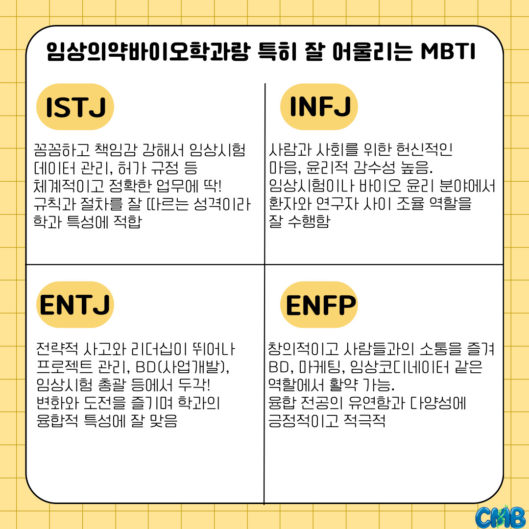 『 [카드뉴스] 임상의약바이오학과 찰떡인 MBTI는? 』글의 상세내용을 확인하는 표로 제목, 부서명, 등록일, 조회, 첨부, 내용으로 나뉘어 설명합니다.