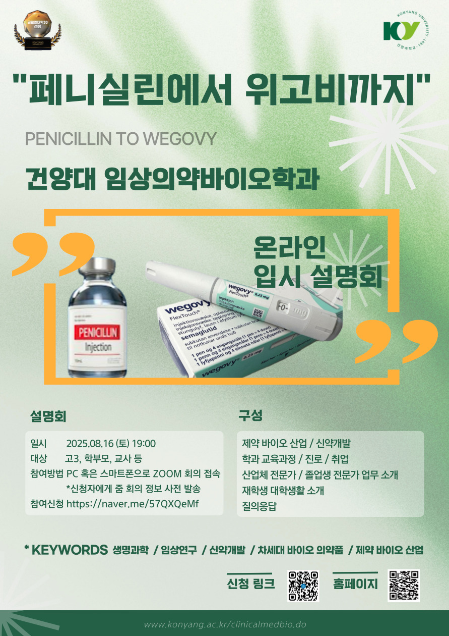 제목 | [건양대 임상의약바이오학과] "페니실린에서 위고비까지" 온라인 입시 설명회 안내 | ||||
